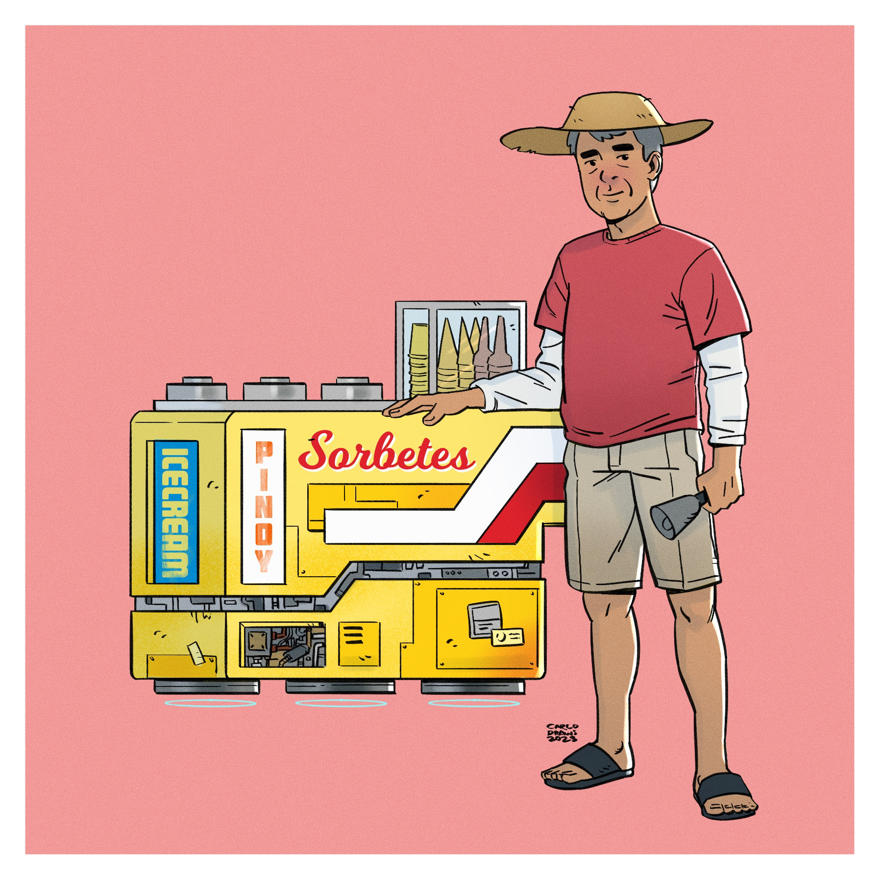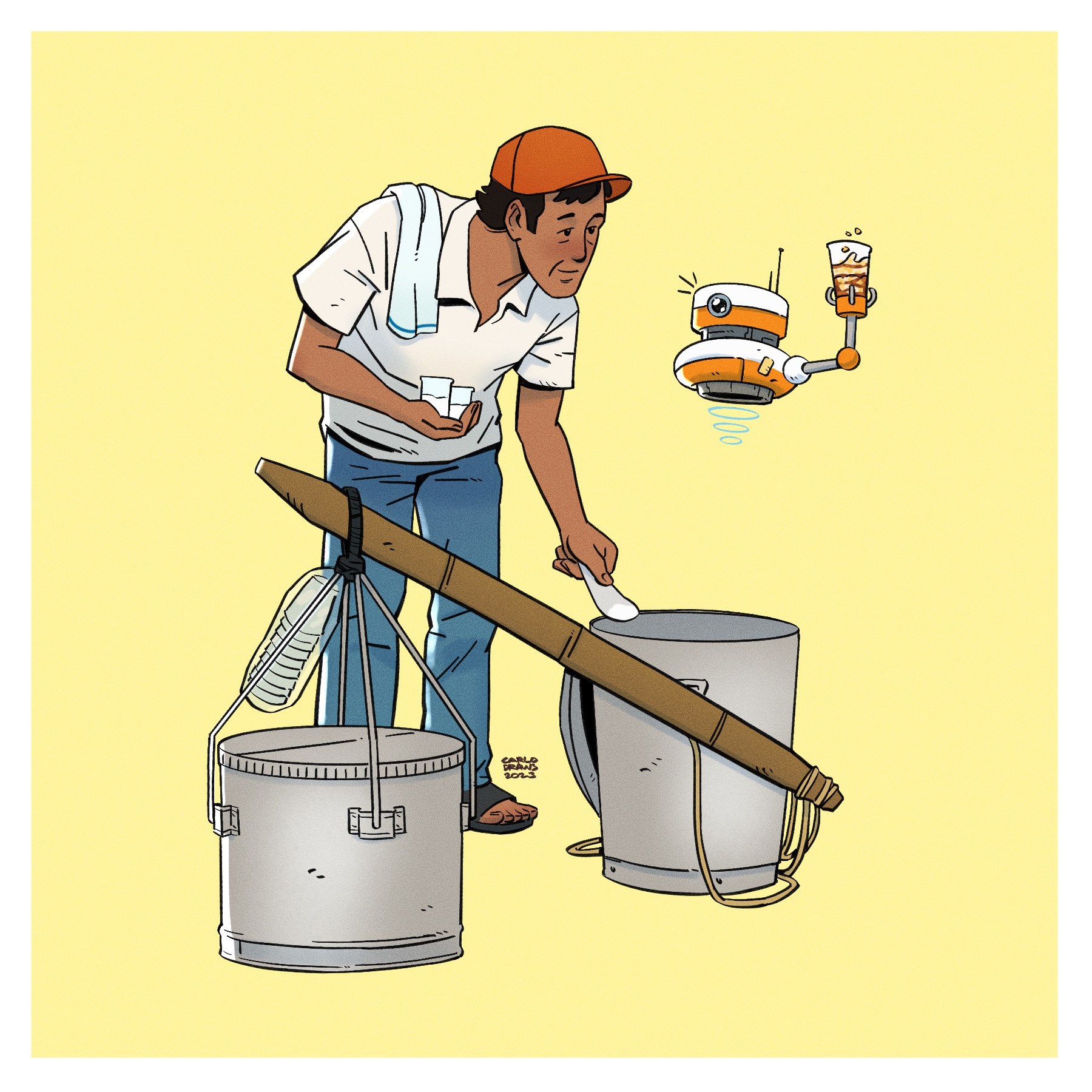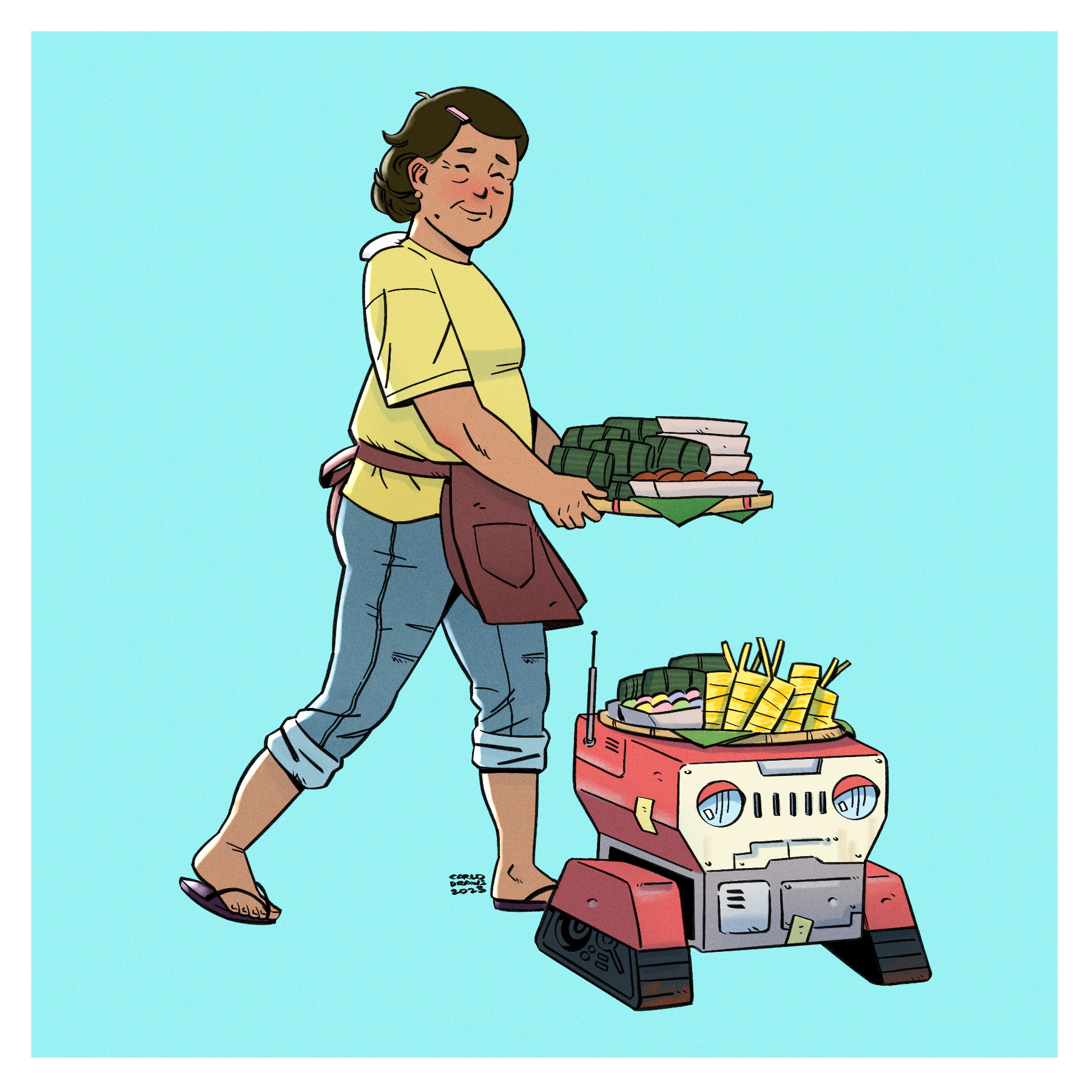 A set of drawings I made where I imagine the future of Pinoy street vendors– one where robotics has progressed immensely and the everyday worker is now aided by these robots
